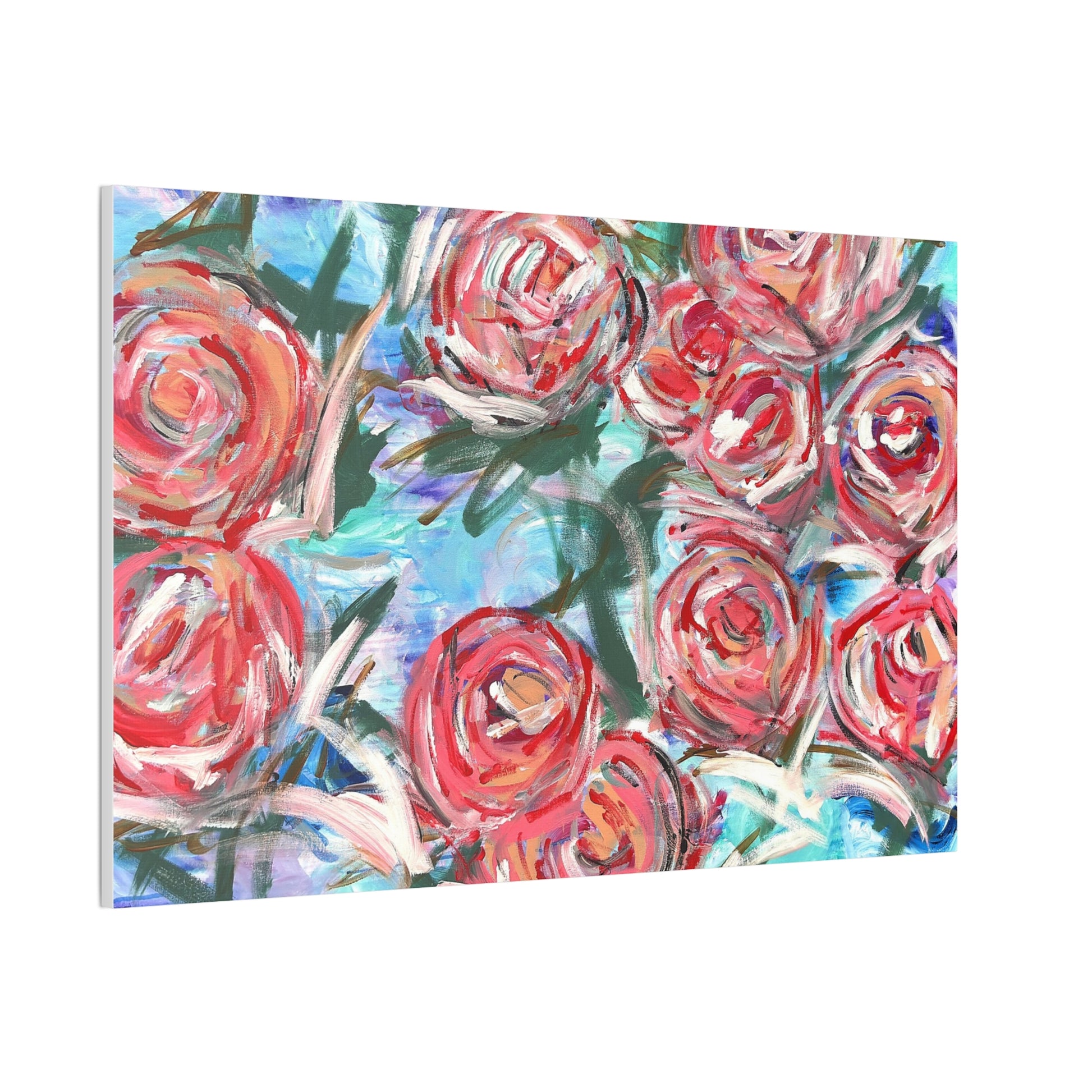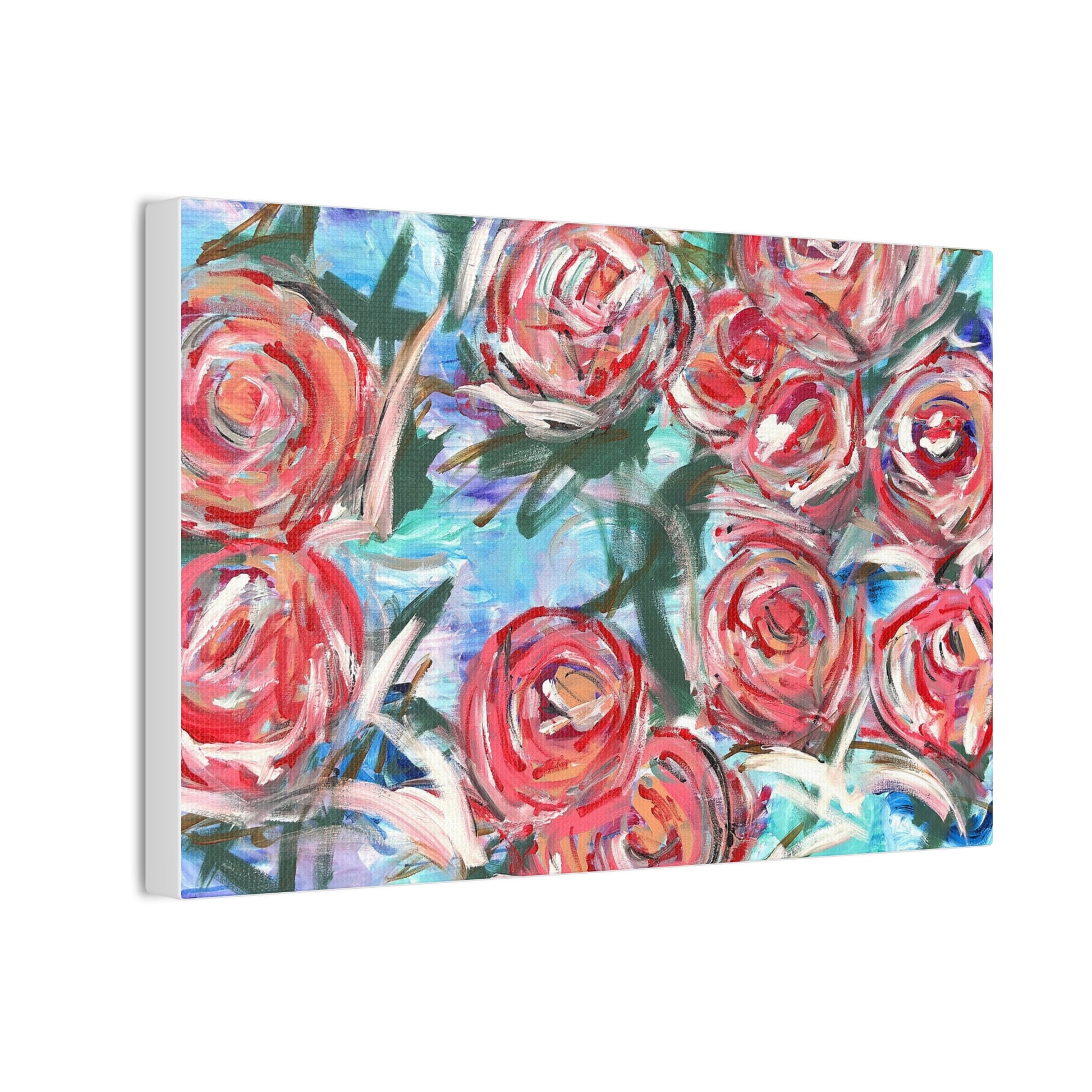 A vibrant stretched canvas that brings painterly blooms into your home with energy and color. Thick pinewood stretcher bars hold a 100% polyester canvas that showcases rich, saturated inks — every brushstroke and splash of coral, pink, and teal reads bright and alive. Hang it over a mantel, lean it on a shelf, or cluster several sizes for a lively gallery wall; the floral composition adds warmth and an expressive, hand-painted feel to living rooms, sunrooms, or creative studios. Small practical touches — included mounting hardware and a discreet QR code on the back — make installation easy, while the variety of sizes and orientations lets you pick the scale that fits your space and vision.